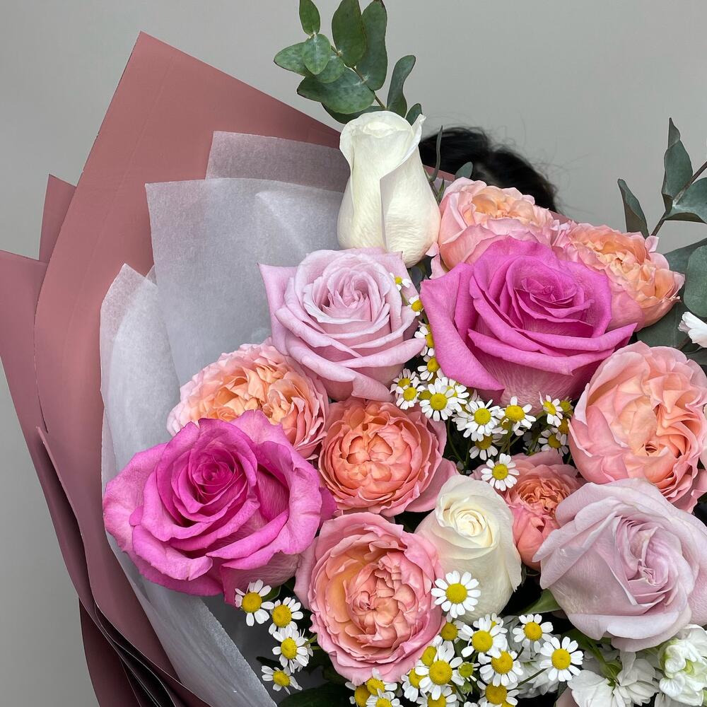 Маттиола - 1 шт. Эвкалипт - 1 шт. Роза - 7 шт. Кустовая роза - 2 шт. Гвоздика - 3 шт. Ромашка кустовая - 2 шт.